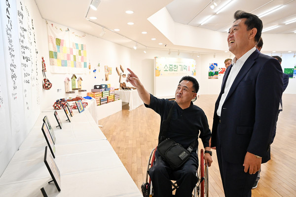 이날 오후 전시장을 찾은 이충우 여주시장은 조정오 여주시장애인자립생활지원센터 소장, 이형우 여주시 도예명장과 함께 전시장을 둘러보며 작품 하나하나에 깊은 관심을 보였다.