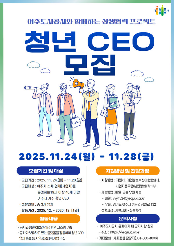 여주도시공사(이하 ‘공사’)는 지역 청년 사업가의 성장을 지원하고 공사와 민간의 상생협력 기발을 구축하기 위해 오는 24일부터 28일까지 ‘청년 CEO“를 모집한다고 밝혔다.