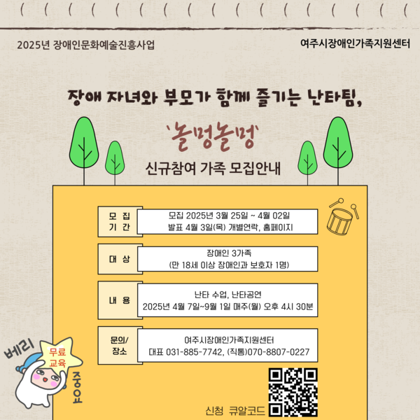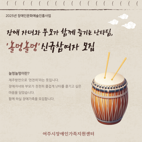여주시장애인가족지원센터(센터장 이선옥)는 2025년 장애인문화예술진흥사업의 일환으로 장애 자녀와 부모가 함께 즐기는 난타팀‘놀멍놀멍’의 신규 가족을 모집한다.
